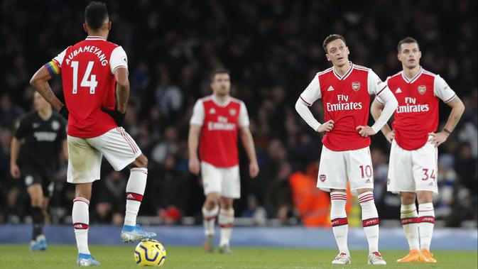 Bek Brighton & Hove Albion, Shane Duffy (kanan) berebut bola dengan bek Arsenal, Sokratis Papastathopoulos pada pertandingan lanjutan Liga Inggris di Stadion Emirates, London (5/12/2019). Arsenal takluk dengan skor tipis 2-1 atas Brighton. (AP Photo/Frank Augstein)