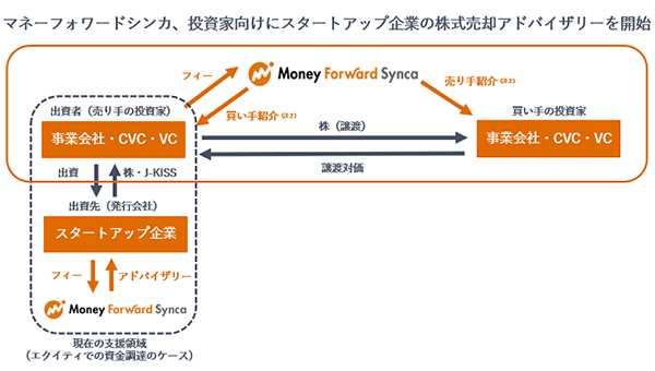 このサービスでは、投資家からの株式売却リクエストをもとに、独自のデータベースから売却先候補を選定し、投資家に対して最適な売却先を紹介する。売却に関する協議は、投資家が出資しているスタートアップ企業の同意のもとで行う。マネーフォワードシンカは、金融商品取引業に該当する行為は行わず、要望に応じてアドバイザーを務める。