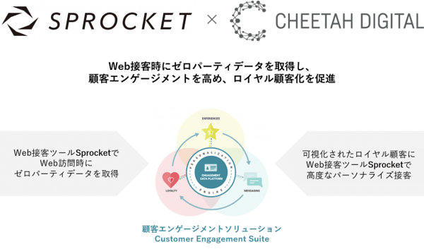 チーターデジタルのマーケティングプラットフォーム「Cheetah Digital Customer Engagement Suite」と、Sprocketのウェブ接客プラットフォーム「Sprocket(スプロケット)」を連携。ウェブ行動・接客データを使ったパーソナライゼーションや、ロイヤルティ(信頼・忠誠心)マーケティングの高度化サービスを共同で展開する。