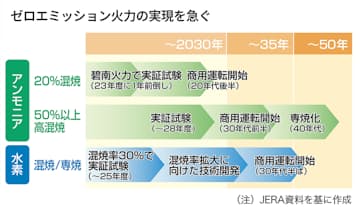 日本最大の火力発電会社、JERAが燃焼時に二酸化炭素(CO2)を排出しない火力発電所の実現に動き出した。まず当初計画より1年前倒しし、2023年度中にアンモニアを20%混ぜて運転する低炭素火力を始める。世界最大級の取扱量を誇る液化天然ガス(LNG)と同様に、アンモニアの安定調達へサプライチェーン(供給網)の構築を急ぐ。小野田聡社長は「水素・アンモニア連合をつくり、安価に発電できる」と本格的な商用運転をにらんでいる。
