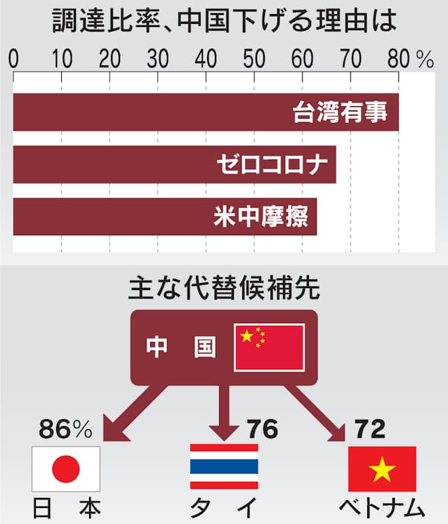 日本経済新聞社が国内の製造業100社に調査したところ、部品などの調達で5割の企業が中国比率を下げると回答しました。米中対立の激化などで、78%の企業が「リスクが高まった」と考えています。台湾有事や、新型コロナウイルスを封じ込める「ゼロコロナ」政策への懸念が高まっています。